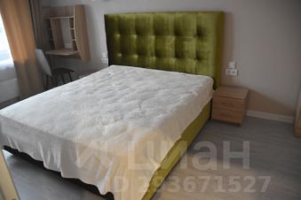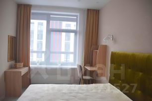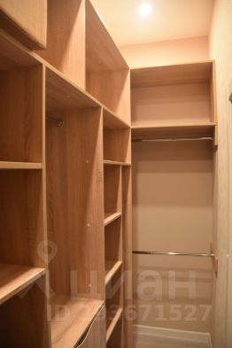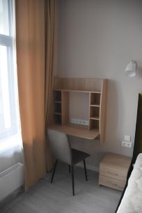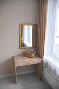 - комната, гардеробная в отдельном помещении с зоной хранения во всю стену, двуспальная кровать с подъемным механизмом, две тумбы, телевизор, зеркало, туалетный столик, подвесной стол для работы или отдыха;