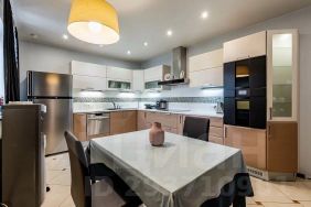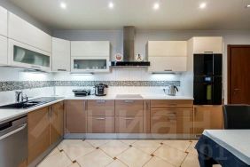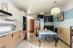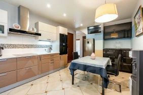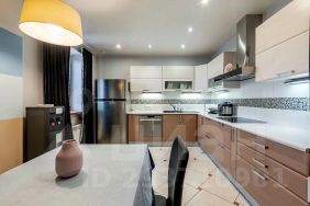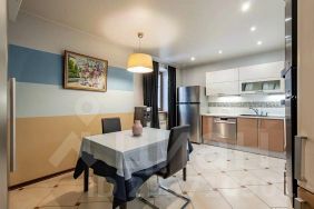 Трёхкомнатная квартира площадью 110,4 кВ.м. Большая кухня,в которой находится стильный кухонный гарнитур ,микроволновка,варочная панель,холодильник,посудомоечная машина,большой стол и стулья.