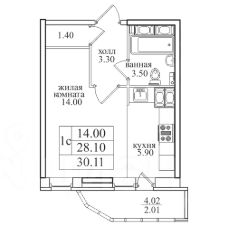 Общая площадь 30.11 м2; кухня-гостиная - 19.9м2, лоджия - 4м2.