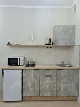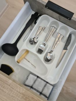 Кухонная зона укомплектована качественным гарнитуром с актуальными фасадами "бетон", стеклокерамической варочной панелью, микроволновой печью, электрогрилем, чайником, современной лаконичной посудой и столовыми приборами для самых эстетичных сервировок. Стол можно использовать как обеденный и как рабочий.