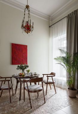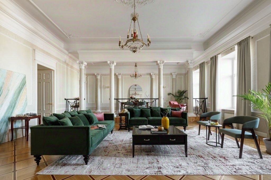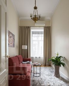 Интерьер оформлен в неоклассическом стиле с двумя историческими каминами, колоннами и люстрами-канделябрами. Здесь — гостиная и столовая зоны, 4 спальни и балкон с видом на собор.
