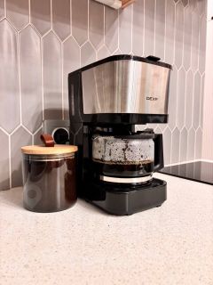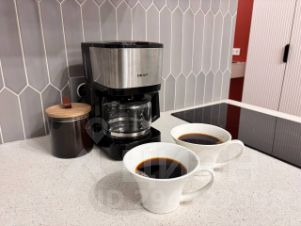 ~ кухня со всей необходимой посудой и встроенной техникой, включая варочную поверхность, тостер, духовой шкаф, капельную кофеварку