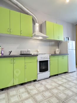 Современная кухня с холодильником, СВЧ печью, электрочайником, плитой и набором посуды