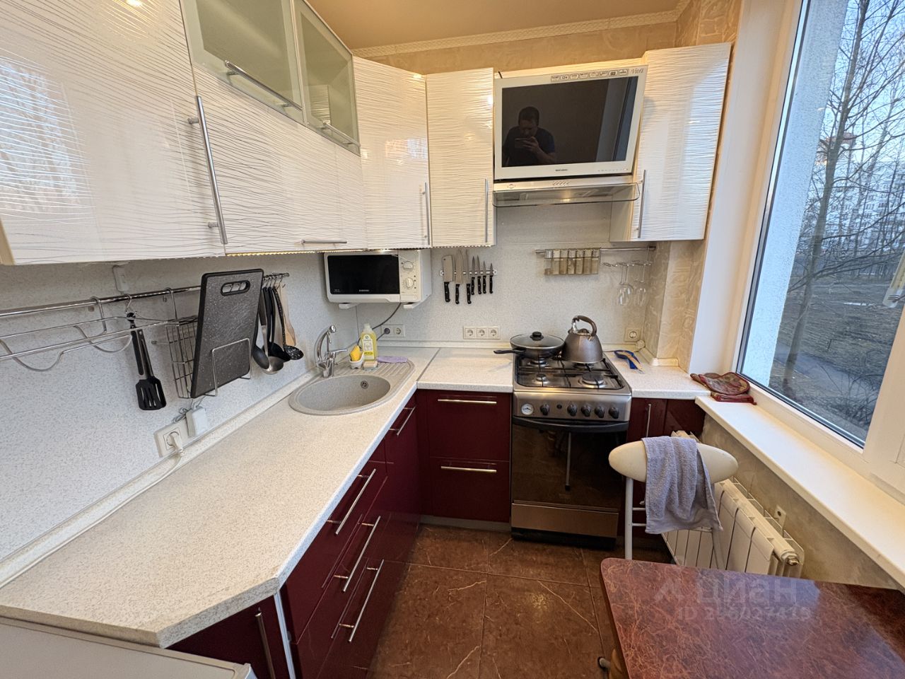 Из бытовой техники: кондиционер Electrolux, холодильник SHARP, пылесос, микроволновая печь Samsung, посудомоечная машина Bosch, газовая плита Indesit, стиральная машина LG, вытяжка MBS с отводом воздуха.
