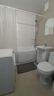 Есть вся необходимая мебель: в кухне — кухонный гарнитур, холодильник, плита, стол, табуреты, стеллаж; в комнате - комфортная двуспальная кровать с подъемным механизмом, вместительные шифоньер и мебельная стенка, комод; в ванне -ванна с двухъярусной полкой, раковина со шкафом для хранения, стиральная машина, тёплый пол; в прихожей - шифоньер с вешалка для верхней одежды; на балконе - напольная сушилка для белья, на полу постелен линолеум.