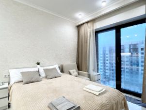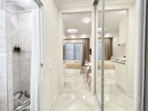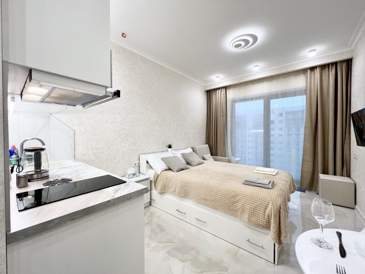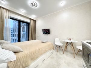 Новая стильная и просторная студия с собственной кухней в доме, построенном в 2023 году. Расположена в живописном месте на Набережной Макарова.