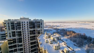 Уникальный вид и высота: Последний, 24-й этаж с панорамными окнами и потолками 3 метра. Яркое, наполненное светом пространство.