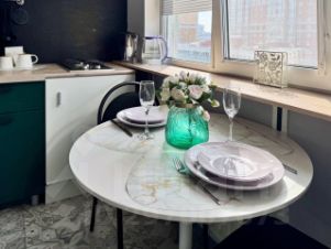 -Полноценная кухня с плитой, холодильником, СВЧ печью, электрочайником и всей необходимой посудой