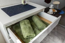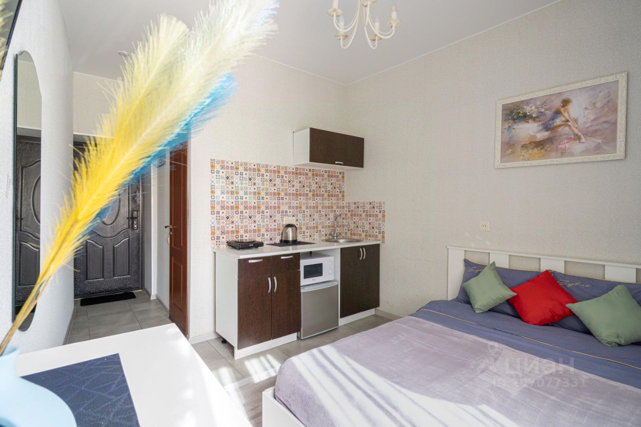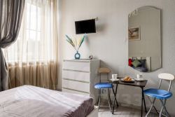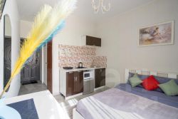 В студии полный уют и комфорт: своя мини-кухня,свой санузел,шикарная двуспальная кровать с ортопедическим матрасом.Бытовая техника и посуда в наличии,тв,стиральная машинка,гладильная доска с утюгом.Студия полностью укомплектована!