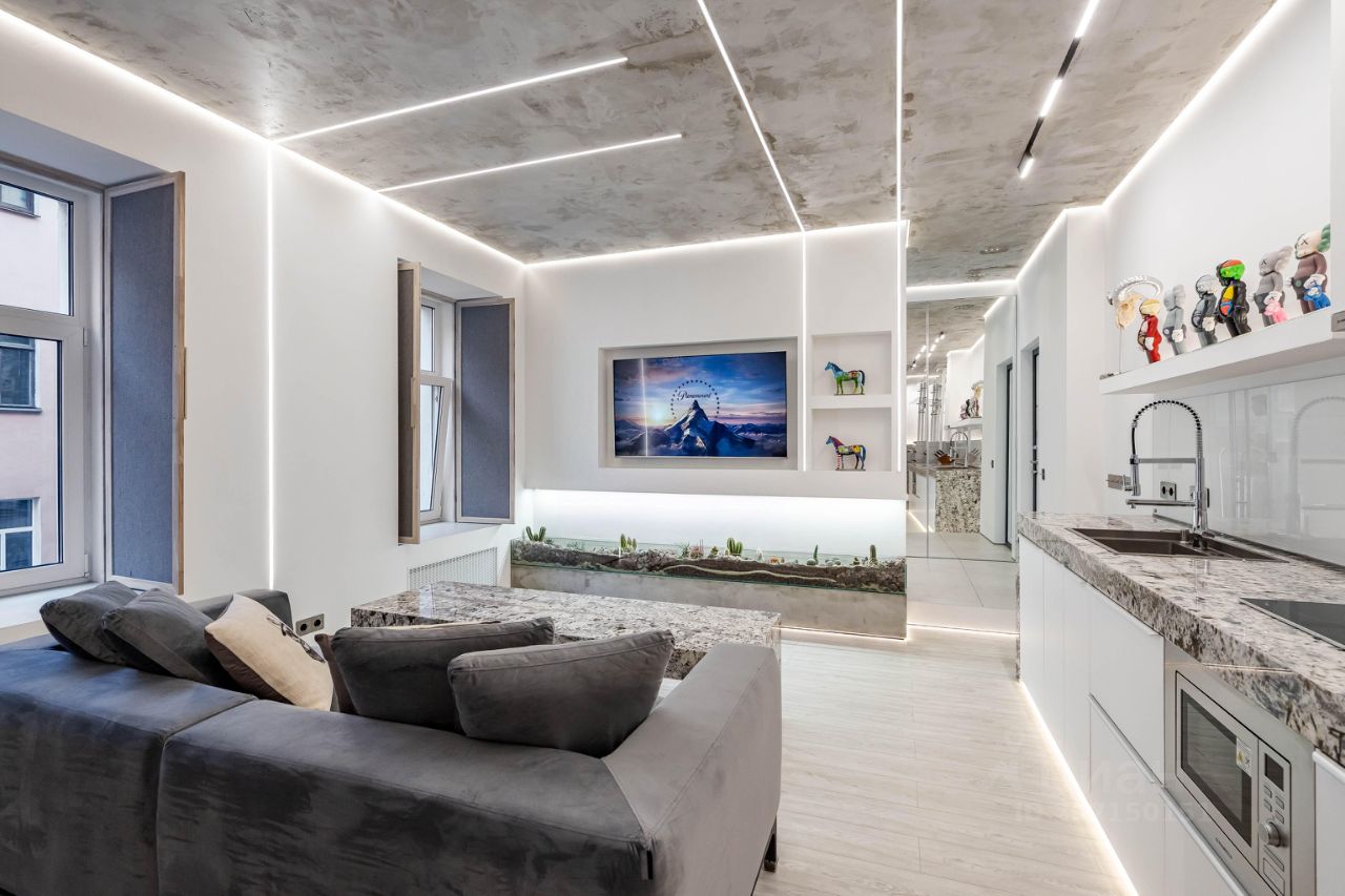 Особая изюминка этой квартиры- разноуровневое освещение , которое позволяет создать невероятную атмосферу и комфорт.