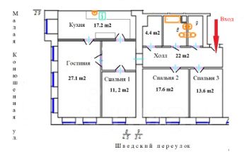 Окна кухни и гостиной (помещения 5 и 6 на плане) выходят на малую Конюшенную улицу.