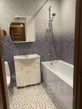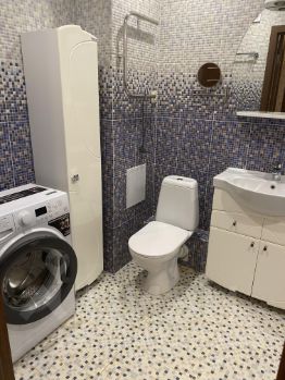 Санузел совмещенный, унитаз Cersanit, смеситель для раковины, а также душевая стойка Swedbe. Также, в ванной комнате комфортно расположена стиральная машинка (Hotpoint Ariston), вместительный шкаф и подвесной шкафчик с зеркалом и подсветкой.