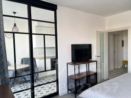 В квартире сделан современный ремонт с использованием высококачественных материалов и сантехники. В квартире новая мебель и техника. Есть стиральная и посудомоечная машины, холодильник , микроволновая печь, бойлер, пылесос.