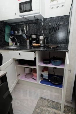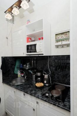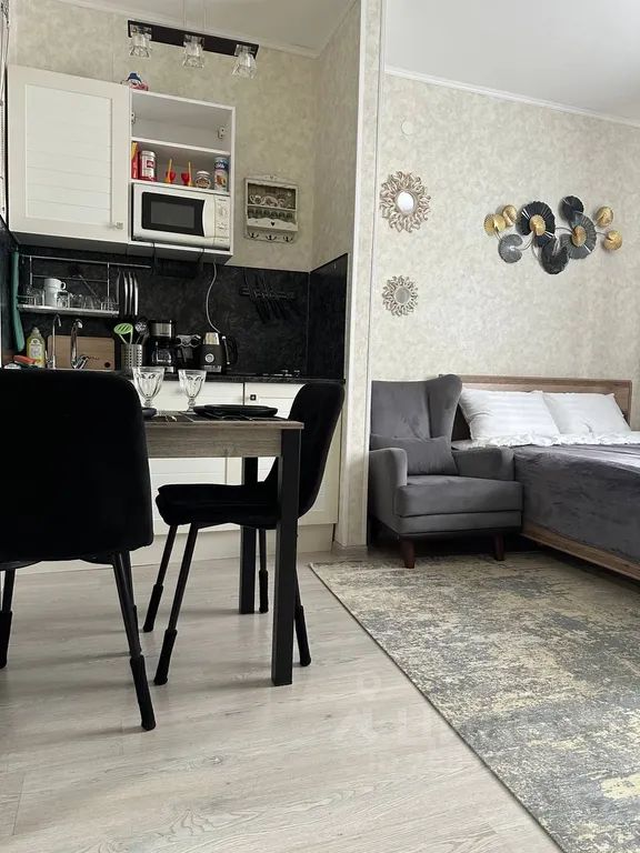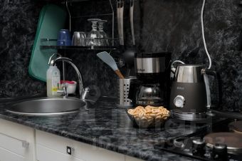 Зона кухни оснащена варочной поверхностью, холодильником, микроволновой печью, электрическим чайником, заварочным чайником и чаем к нему, кофеваркой (также в квартире имеется заварной кофе). В шкафах и ящиках хранится посуда (кастрюли, ковшик, сковородки), тарелки, чашки, фужеры, стаканы и столовые приборы, а также необходимые мелочи (лопаточки, штопор, открывалка и прочее). В зоне кухни установлен обеденный стол. Также имеется кран-фильтр для питьевой воды В качестве комплимента к чаю или кофе в нашей студии приятные сладкие гостинцы для каждого гостя