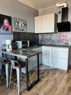 Кухня оборудована всем необходимым для приготовления еды: полноразмерный холодильник, микроволновая печь, посудомоечная машина, индукционная варочная панель, кофемашина. Санузел с душем и стиральной машиной.