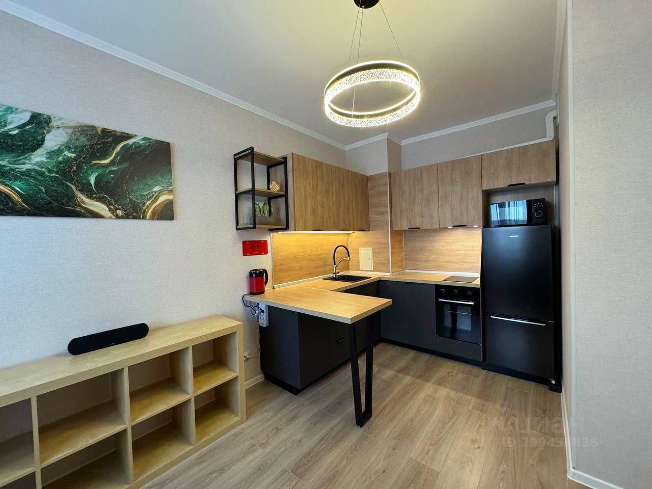 В кухне-гостиной компактный диван, который раскладывается в гостевое спальное место, стеллаж для хранения, журнальный столик. Обеденная зона за барной стойкой, два полубарных стула. Оборудование кухни: посудомоечная машина, варочная панель с вытяжкой, духовка, холодильник, микроволновка, чайник, фильтр питьевой воды, беспроводная акустика Creative D200.