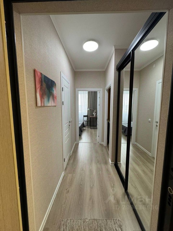 В прихожей за зеркалом спрятан большой встроенный шкаф для одежды и хранения.