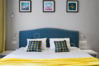Для гостей предлагается удобная двуспальная кровать , 2 односпальные кровати и 2 дивана .