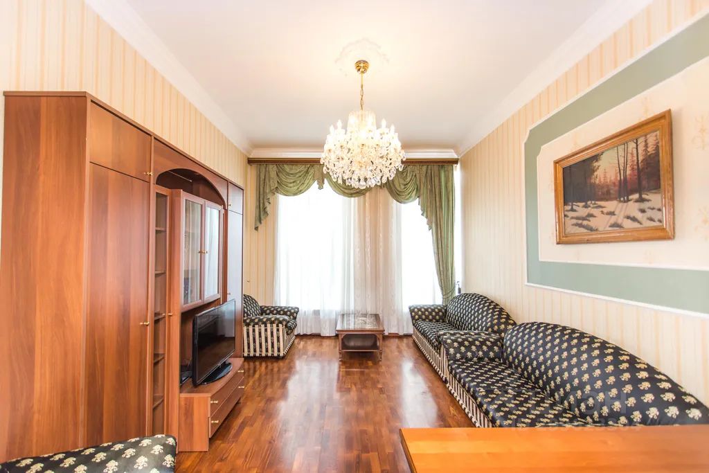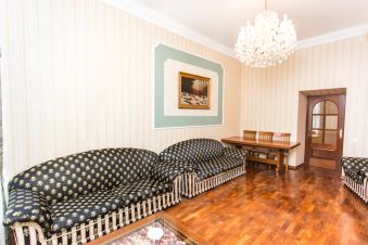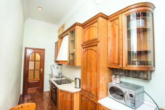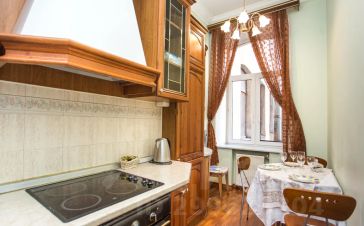 Квартира состоит из 2 спален с большими удобными кроватями, гостиной с 1 раскладным диваном, отдельной кухни. Окна спален выходят во двор, окна из гостиной — на улицу Большую Морскую. В квартире есть всё необходимое для комфортного проживания.