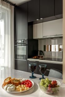 ~ кухня со всей необходимой посудой и встроенной техникой, включая индукционную плиту, посудомоечную машину, микроволновку
