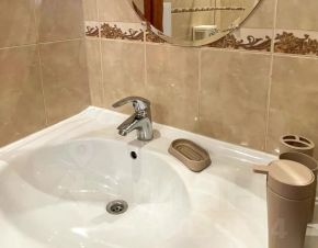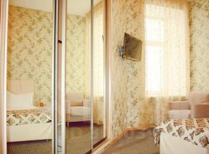 Двухкомнатный семейный номер с собственной ванной комнатой 42 кв. м. В спальне: двуспальная кровать размер king-size, большой шкаф. В гостиной: двуспальный диван, камин. В ванной комнате: душ, ванная, туалет, раковина, биде, фен. Каждому гостю (бесплатно) предлагаются: туалетные принадлежности — гели для душа, шампунь, комплект полотенец. На этаже есть просторная кухня: плита, печь, посудомоечная машина, холодильник, печь СВЧ, электрический чайник, вся необходимая посуда для питания и приготовления пищи. Также в бесплатном потреблении для гостей соль/сахар, чай, очищенная вода. Стиральная машина, утюг, гладильная доска и сушилка для белья находятся в зоне общего пользования в отдельной комнате на этаже, и предложено для бесплатного использования. Гостевой дом расположен на 4 этаже в доме с лифтом. Окна выходят в тихий двор.