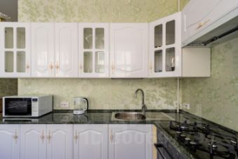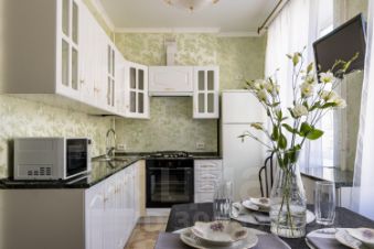 На кухне большой обеденный стол за которым с комфортом разместятся 6 человек. Современная техника: духовка, микроволновка, газовая плита, все принадлежности для приготовления пищи.