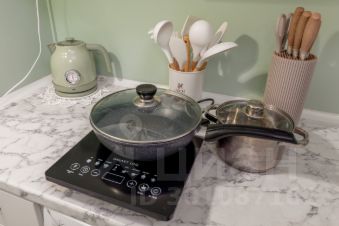 Мини кухня с индукционной плиткой, набором посуды для приготовления пищи, чайник, большой вместительный холодильник, микроволновка, раскладной столик и деревянные табуретки