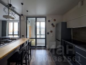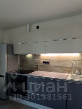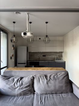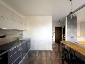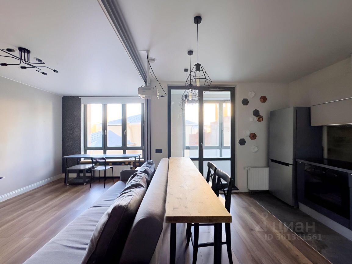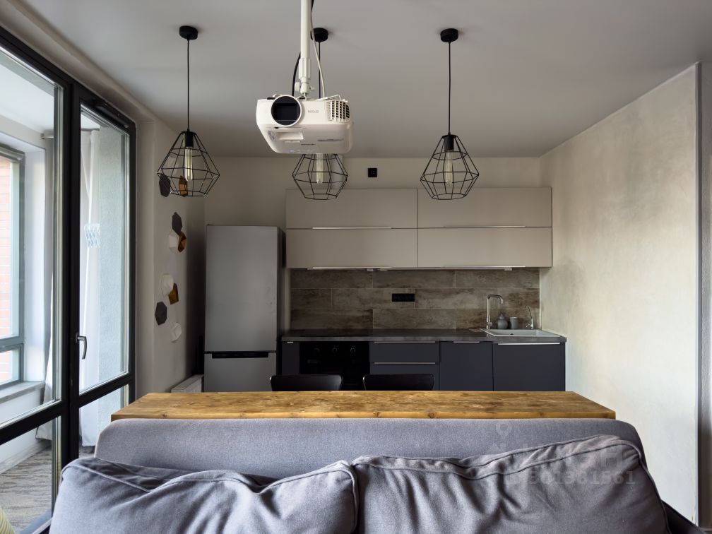 3. Кухня с полноценным кухонным гарнитуром, установлен духовой шкаф и посудомоечная машина 45 см, холодильник, варочная панель и вытяжка. Функцию стола несет деревянная барная стойка со стульями, над которой висит проектор Epson.