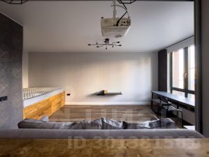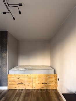 5. Гостиная комната с комфортным диваном и пустой стеной для проектора, пространство зонировано на рабочую зону и зону спальни в нише, да это такая высокая кровать, внизу спрятаны места хранения.