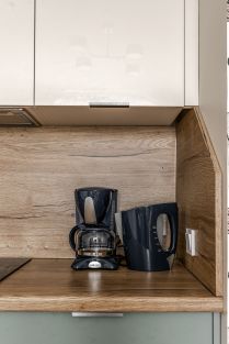~ кухня со всей необходимой посудой и техникой, включая посудомоечную машину, кофеварку, микроволновую печь и электрический чайник