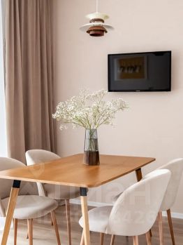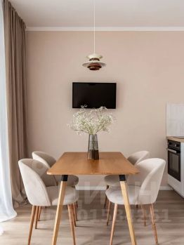 В студии есть Wi-Fi (интернет), а также телевизор со Smart TV.За столом могут удобно разместиться 4 человека, при этом за ним удобно как обедать, так и работать с ноутбуком.