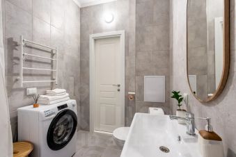 В ванной комнате установлена стиральная машина, а также в распоряжении гостей фен для волос, утюг, сушилка для одежды (раскладная), бытовая химия (средство для мытья посуды, жидкое мыло, стиральный порошок, шампунь, гель для душа, ушные палочки).