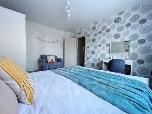 В спальне 2-спальная кровать с ортопедическим матрасом 160 см и раскладной диван на 1 человека, в гостиной раскладывающийся 2-спальный диван 140 см шириной.