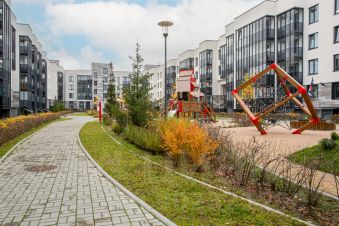 Двор без машин с детским городком дает возможность спокойно прогуляться с детьми в любое время.