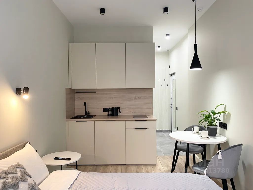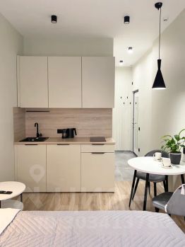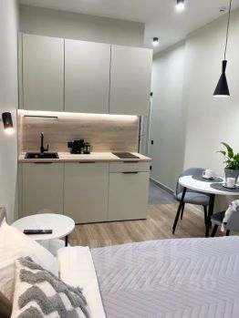 Студия очень светлая и уютная. Новый дизайнерский ремонт, широкая удобная двуспальная кровать с прекрасным матрасом Аскона 160х200 (качество сна!), продуманные различные сценарии освещения, полностью оборудованная кухня со всем необходимым (микроволновая печь, холодильник столовые приборы и кастрюли, электрочайник, заварной чайник...), обеденная зона, которую также можно использовать для работы на компьютере (мы предусмотрели розетки), просторная ванная комната с душевой зоной, стиральной машиной, бойлером, зеркалом), вместительный шкаф и зеркало в пол, гладильные принадлежности, постельное белье и полотенца, а также средства гигиены.. Учитывались все мелочи для удобства наших гостей.
