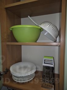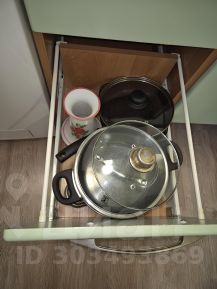 Кухня небольшая: Микроволновка, эл.чайник, посудомойка, стиралка, холодильник, кастрюльки, сковородка, посуда, сушилка, гладилка.