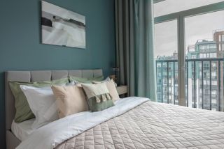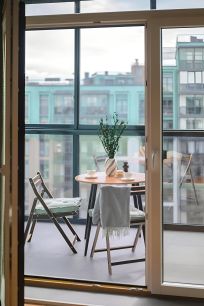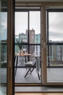 Окна в пол, распашные и в гостиной, и в спальне. Оба окна на юго-запад. Из гостиной выход на просторный балкон с панорамным остеклением и боковым видом на реку, в спальне обустроен французский балкон. Высота потолков 3 метра.