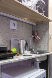 - мини- кухня с необходимым набором посуды и столовых приборов, чай, сахар, перец, соль