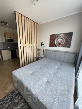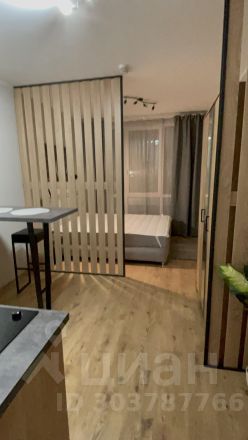 Студия зонирована декоративными деревянными перегородками на две зоны - кухню и спальню.