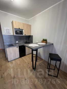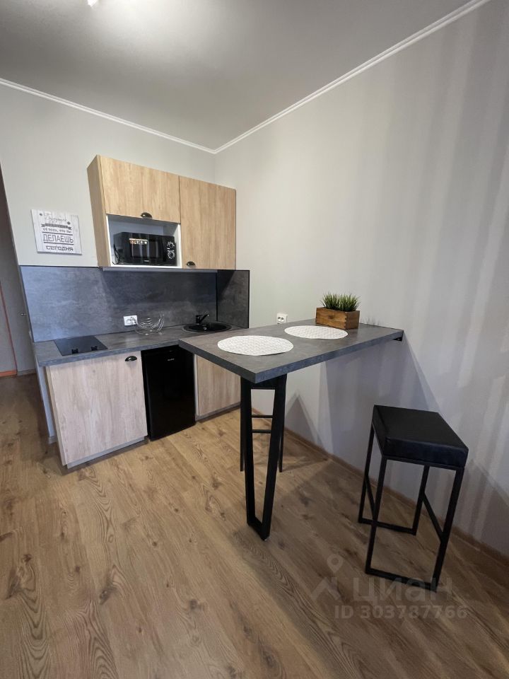 Зона кухни оборудована стильной кухней в стиле лофт с подсветкой в зоне кухни, холодильником, микроволновой печью, встроенной варочной панелью, барной стойкой со стульями, настольным светильником.