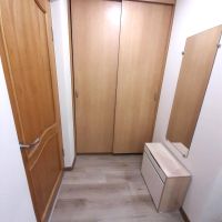 В большой комнате 22 м2 новый диван, кровать с новым матрасом, вместительный шкаф, телевизор, столик для ноутбука.