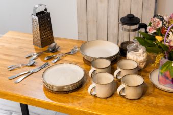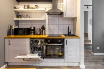 - кухня со всей нужной бытовой техникой и посудой для приготовления еды