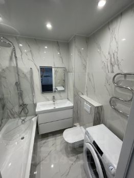 Интерьер квартиры выполнен в современном стиле. В наличии вся необходимая мебель на кухне и в комнате, поэтому можно сразу заселяться и наслаждаться комфортом. Из техники есть холодильник, микроволновая печь, чайник, телевизор и стиральная машина. В ванной комнате установлена ванна, что позволит расслабиться после долгого дня. Также предусмотрен теплый пол в совмещенном санузеле.