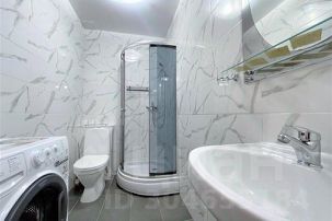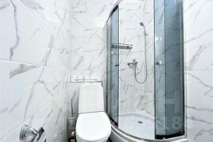 Чистый, в кафеле. Душевая кабина, туалет, раковина, зеркало с подсветкой, фен.