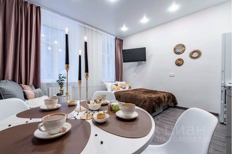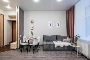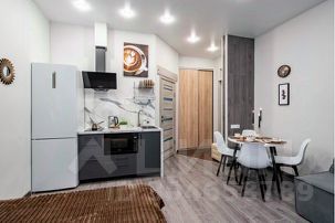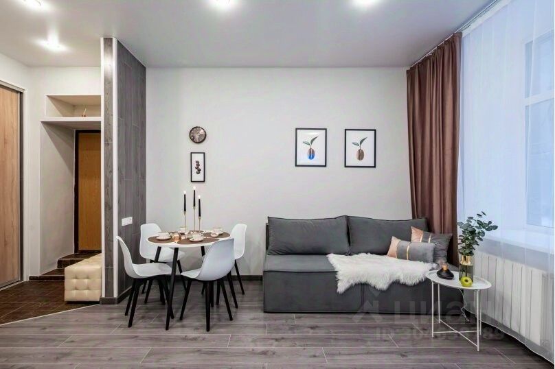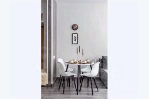 В комнате 2 двуспальных раскладных дивана, обеденная группа, и кухонная зона.