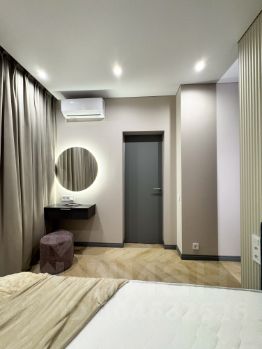 Из несомненных плюсов квартиры: просторная гардеробная, что редкость для такой площади. Паркетная доска даст приятные ощущения вашим ногам, шторы с электроприводом помогут меньше напрягаться во время отдыха, ну а просторная гардеробная поможет уместить все ваши наряды