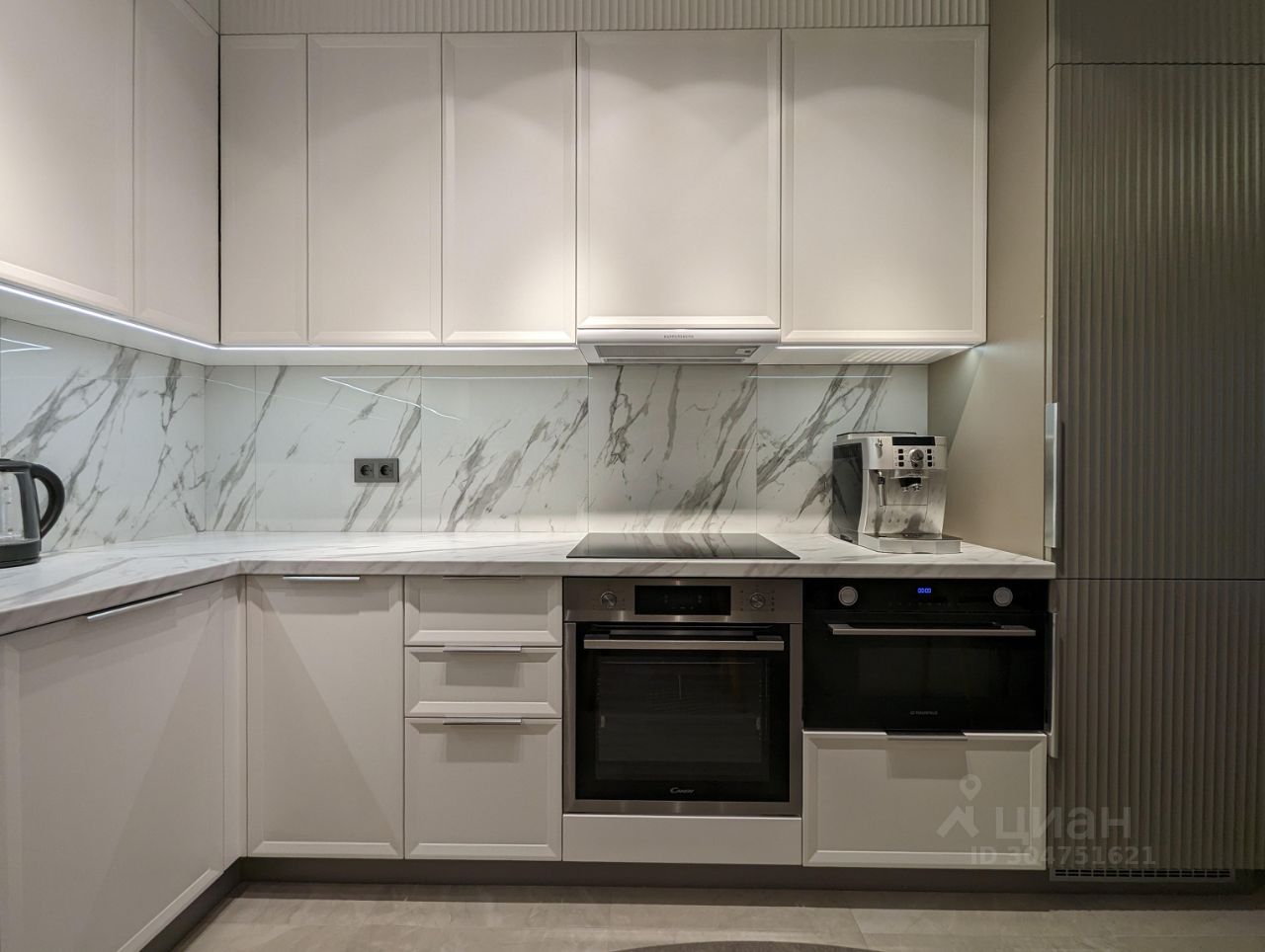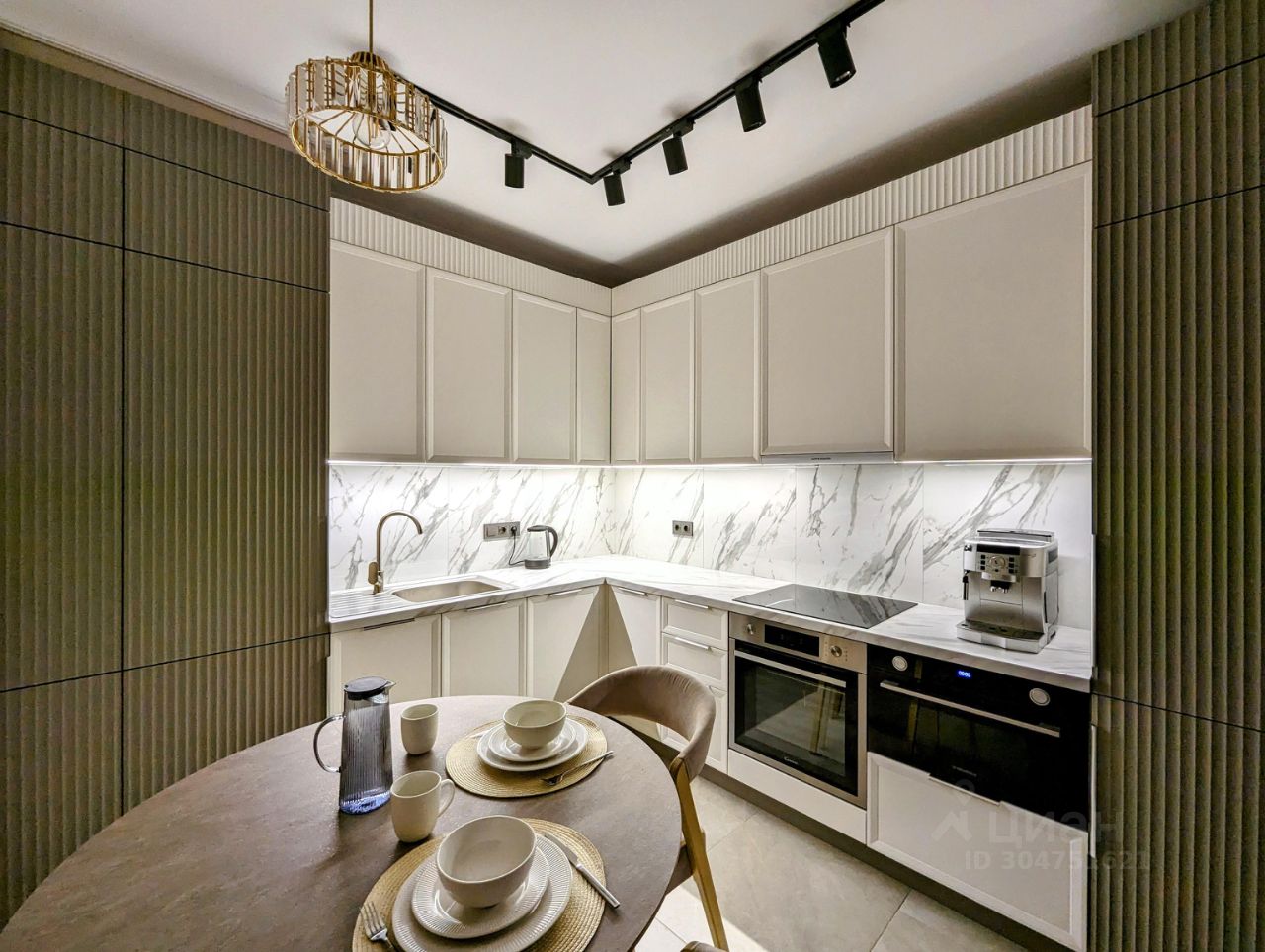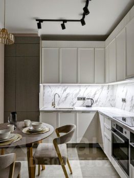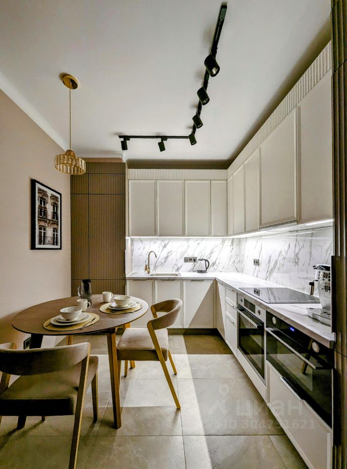 * Просторная кухня выполнена в пастельных тонах в стиле современной классики. Встроенная техника Gorenje, Kuppersberg и т. д. Огромный телевизор LG 65 дюймов.