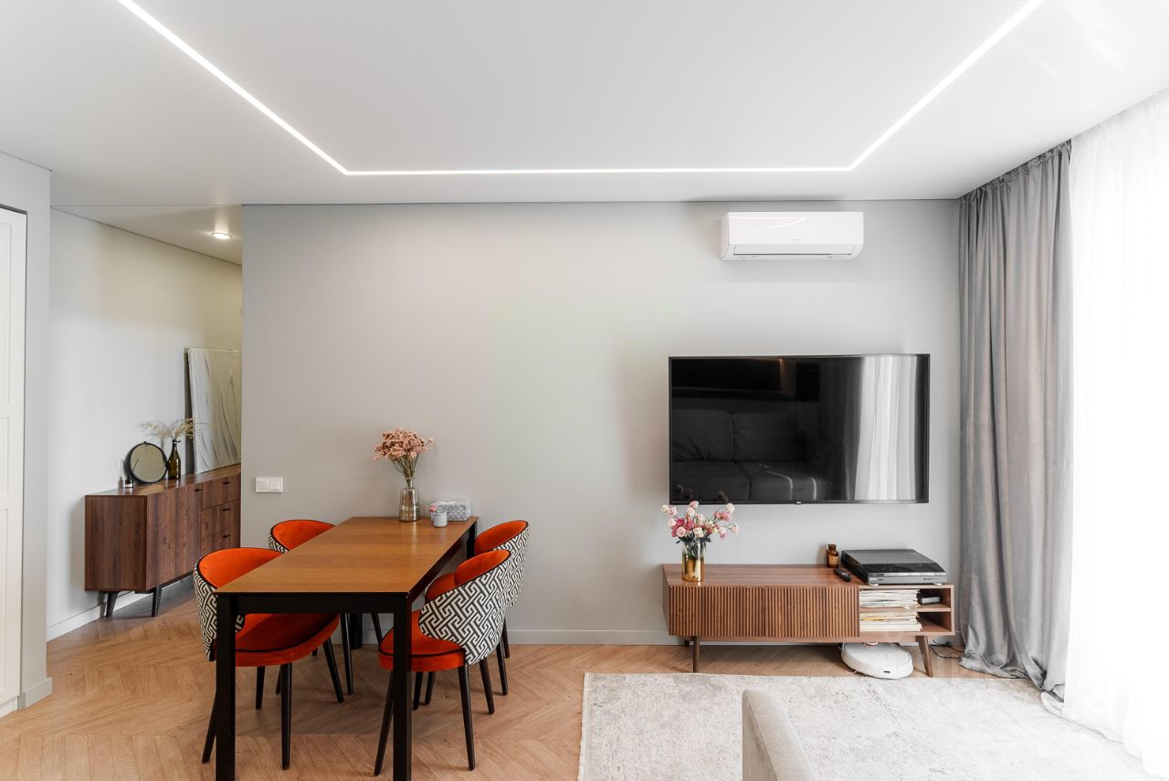 В кухне-гостиной все для отдыха, развлечения и готовки. Большой смарт-телевизор, раздвижной обеденный стол с акцентными яркими стульями, диван с раскладывающимся спальным местом. В кухонном гарнитуре большое количество всевозможных мест хранения. Качественная дорогая бытовая техника: индукционная варочная плита, духовой шкаф, посудомоечная машина, микроволновая печь, холодильник.
