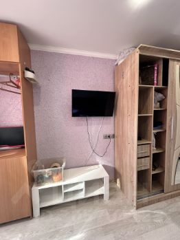 В комнате имеется большой шоколадный диван с выдвижными отделениями для хранения вещей, зеркальный шкаф-купе, столик, стул, кресло и телевизор на кронштейне. Под телевизором расположен столик.