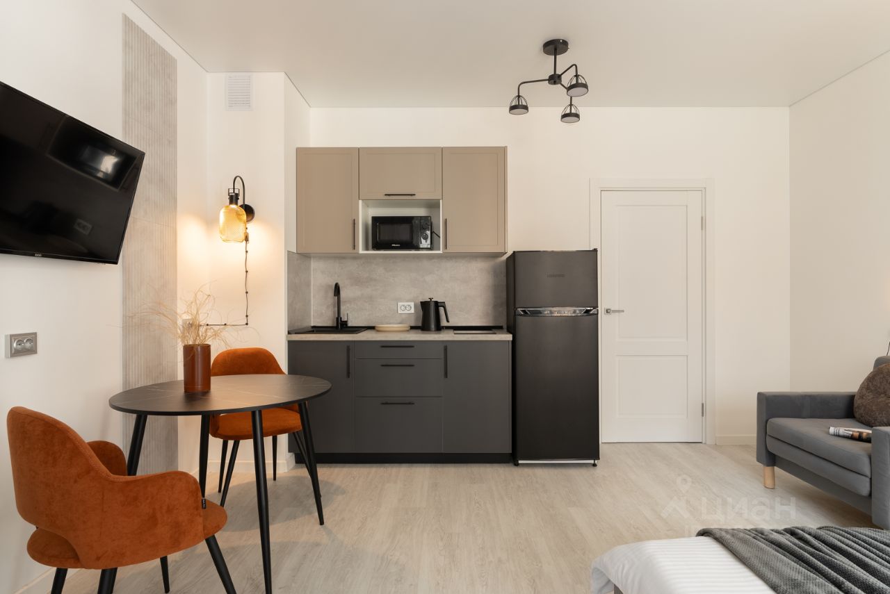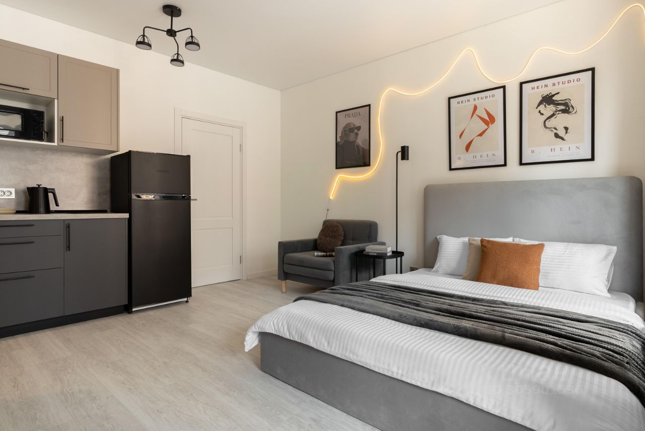 Кухонная зона оборудована всем необходимым для приготовления пищи. Вы найдете плиту, холодильник, микроволновую печь и посуду, чтобы с легкостью приготовить свои любимые блюда и насладиться домашней атмосферой.